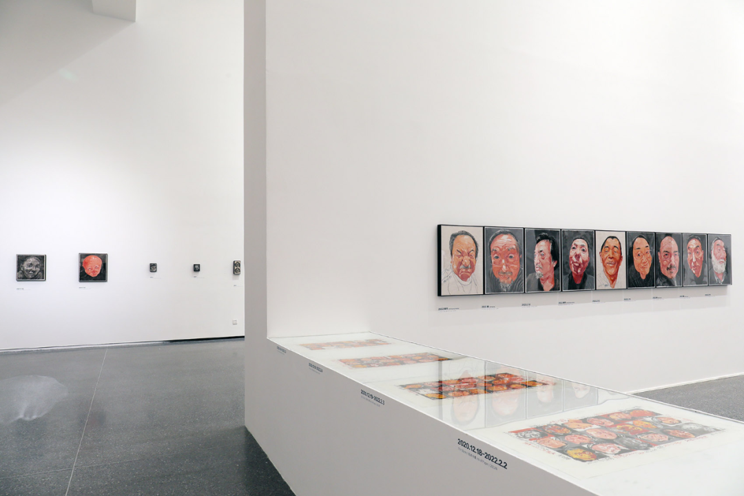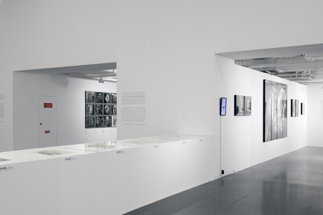 为解决空间通透感不足的问题,设计团队采取了开窗的设计方案。这些“窗口”被错落设置,其尺度和位置都经过精心考量,同时“窗台”也被设计成可以作为展台使用。通过设置这些“窗口”,观展者的视线和空气得以在整个空间自由流通,增强了空间的通透感。由于“窗口”的错落设置,展览空间形成了远近、虚实、藏露、动静、开合等多种对立统一的关系,使观众在观展过程中体验到更多的视觉和空间上的变化和情趣。作品则按照方力钧先生时空记忆的顺序线索进行布局,有的挂于墙面,有的放于展台上,以此呈现画、情和境的完备性。