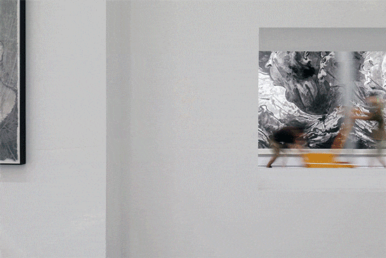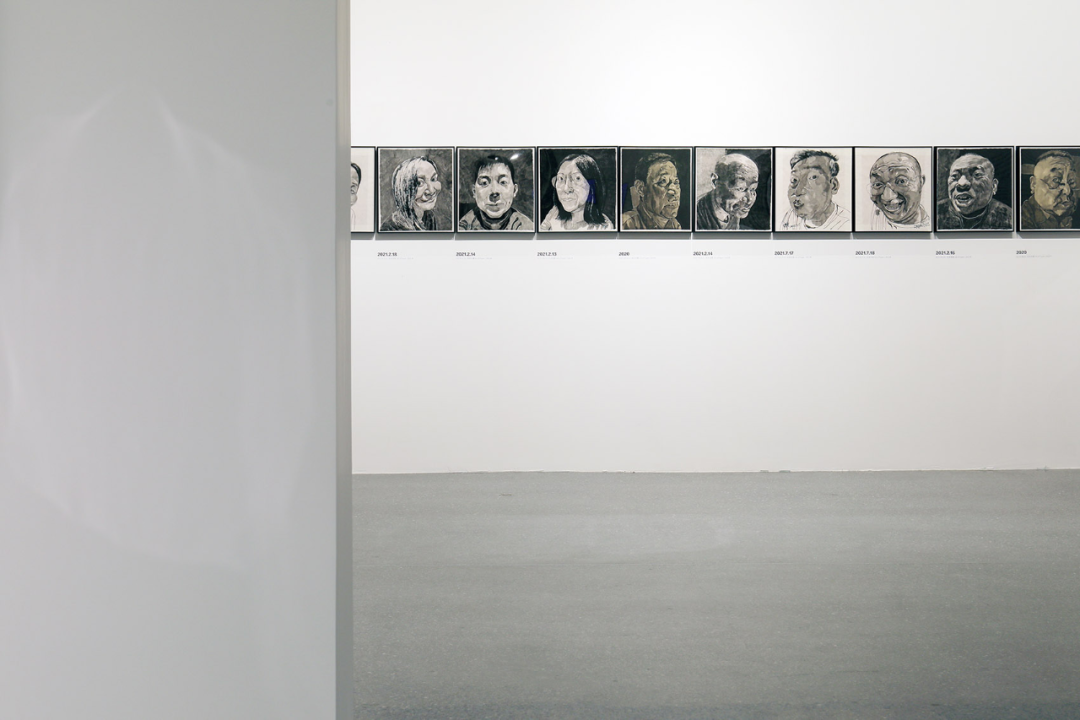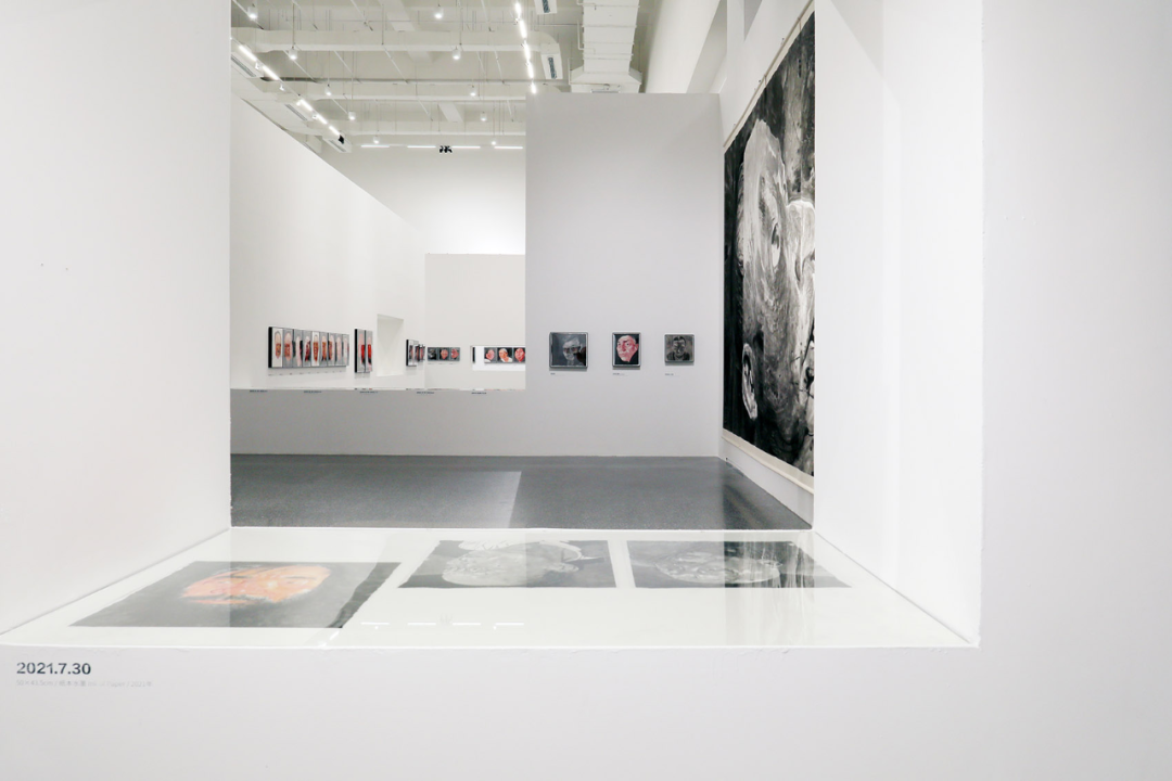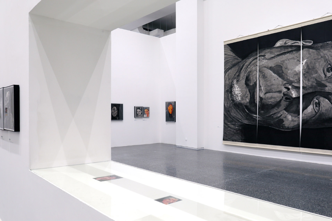 进入展览的中段,观展方式由静观转变为动观,“游”成为主要的观展方式。水墨肖像在这个过程中也呈现出多样的变化:黑白和彩色的肖像交替出现,画作的尺寸从几厘米到数米不等,有些小画作可以握在手掌之间,而巨制的画作则可以铺满整面高墙。画作的排列也经过精心设计:有的聚集在一起并置展示,有的独立呈现,有的等距均列,有的大小呼应。观众在“游”览的过程中,不断穿梭于这些画作之间,感受到空间的层层叠叠,水墨内容、颜色、笔触和比例变化多端。这种“游”览就像是欣赏一幅长卷,观众可以在“游”览中驻足停留,体验到动与静相互谐合的愉悦时刻,享受其中的怡情之乐。