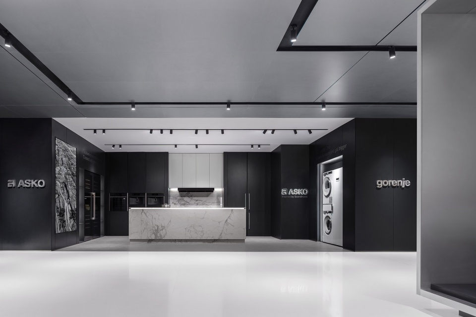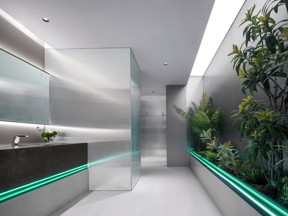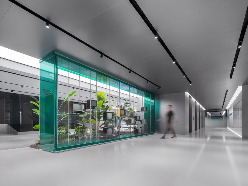 展厅融合展示了集团所涉及的各个领域。设计师通过极简中性的色彩包容不同领域的场景和产品,并且通过品牌绿色的玻璃串联起统一的视觉语言。