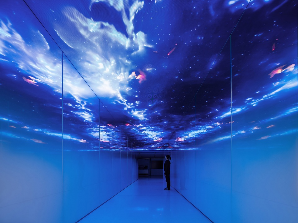 通道两侧的渐变镜面墙横向拓展了顶部的空间,让人仿佛置身于浩瀚宇宙之中。