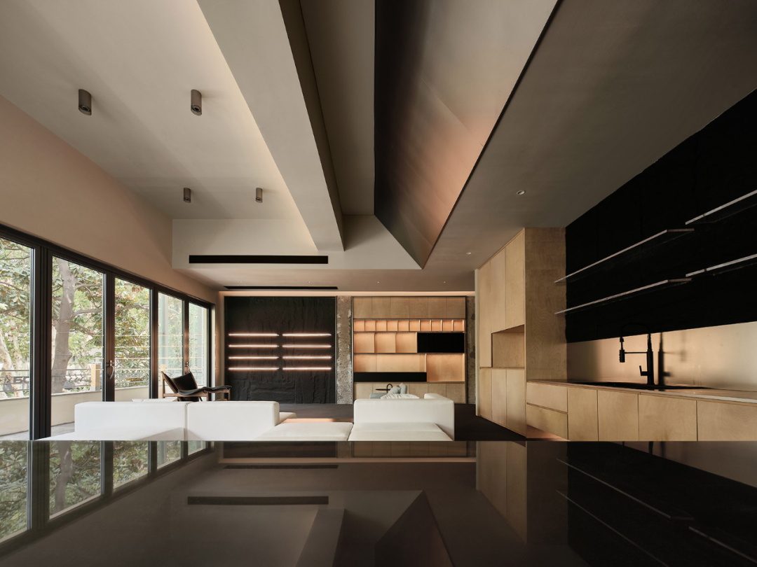 一层空间需要更加灵活开阔,因此通过具体量感的吊顶和大体块进行空间划分,丰富了空间的体验层次。在室内外边界处理上,采用了具有功能性的体块,提升了空间的互动性和开放性。