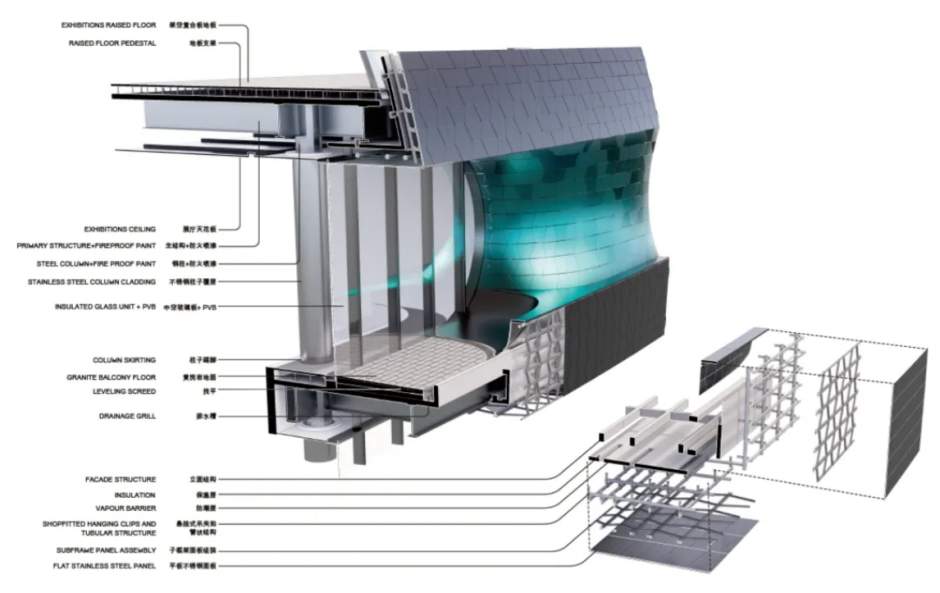 建筑以自然形态为灵感来源,形态模拟鹅卵石之柔美,设计巧妙地引领访客穿梭于一系列以中庭为核心的空间内,并将城市与公园的景观与馆内活动完美融合。馆幕墙由8万多块不锈钢面板组成,分灰蓝两色,呈水滴纹理,能模拟出极光、星云等宇宙现象,充分契合了科技馆的主题。该建筑外立面有极高的隔热性,同时还采用了高效节能玻璃、暖通空调、照明和智能楼宇管理系统,以优化节能效果。除此之外,雨水回用、可再生能源利用、太阳能发电等技术可以最大限度地提高建筑物被动式节能设计原则的有效性。