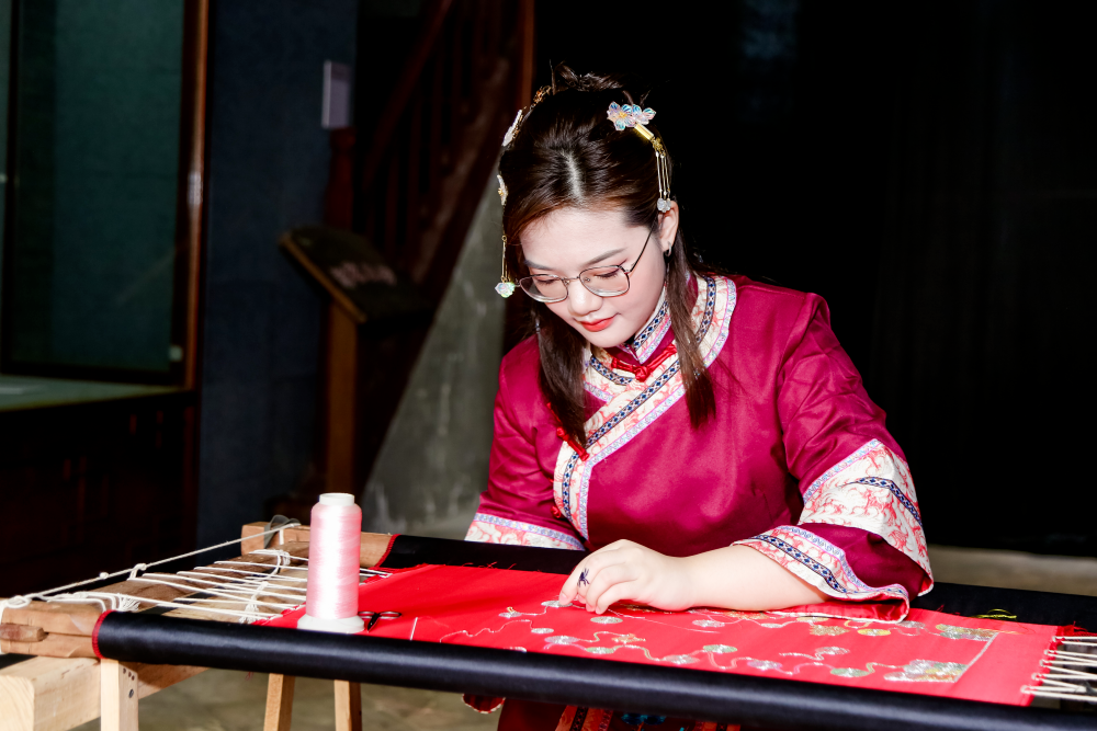 值得一提的是,《龙凤绣坊》不仅完美演绎了扑朔迷离的悬疑剧情,更巧妙的将钉金绣制作技艺、灰塑制作技艺、本土美食等花都非遗元素融入剧情之中。让游客在角色扮演、答题解密、搜证破案的过程中沉浸式体验、了解花都璀璨的非遗文化。在这里,玩家们可以亲自上阵,体验裙褂绣制与灰塑制作,以获得解密线索。在刺激烧脑的剧情推动下,平日里略显枯燥的传统技艺也变得更加生动有趣。潮流与非遗相结合的创新玩法,也为游客们带来了耳目一新的传统文化新体验。