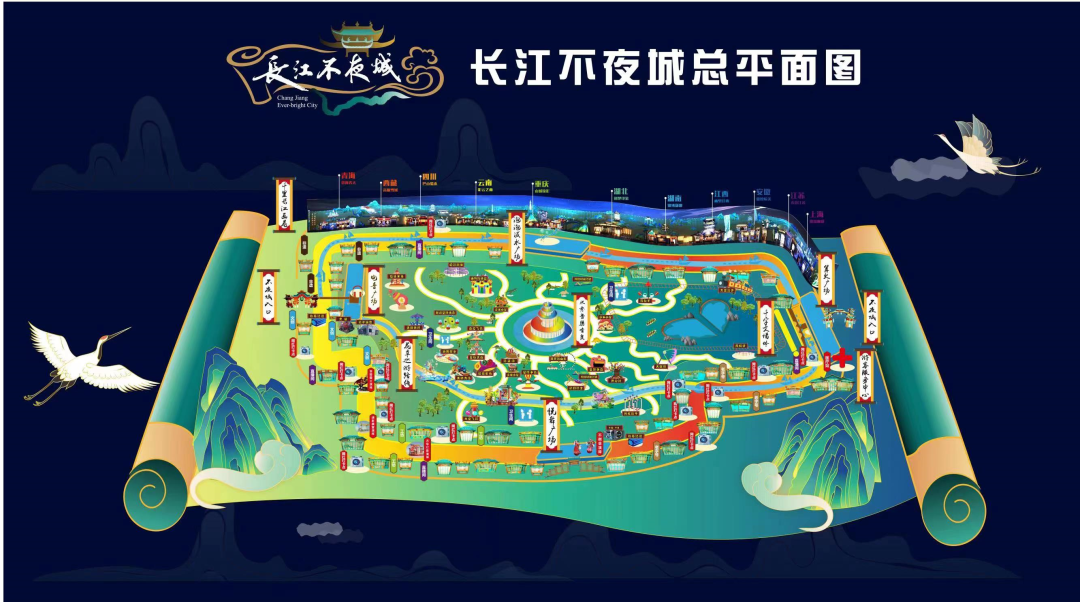 长江不夜城街区总长1100米,占地面积134亩,整体布局围绕长江文化,集合夜间观光游憩、国潮场景、行为艺术演绎、科技体验、特色美食、网红打卡、水景水秀等于一体形成夜游IP点。