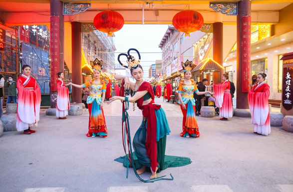 此外,为了丰富敦煌夜市特色商业街的消费业态,街区招徕木刻画、敦煌杏皮水、敦煌曲子戏等6个国家级和省级非物质文化遗产项目,并常年在街区进行非遗创作展演。同时,为带动了敦煌夜间消费持续升级,打造‘夜秀、夜节、夜宿、夜市、夜食、夜展’等夜游主题模式,引进驻场演艺、手鼓表演、汉服展演、美食展示等网红体验活动项目,举办各类传统节庆活动,极大地丰富了游客及市民的参与度和体验感。