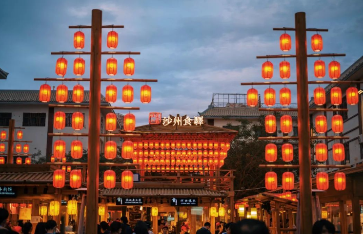 始建于1991年的敦煌夜市特色商业街区,地处敦煌市沙州镇阳关中路,总占地面积约6.9万平方米,由沙州市场、秦州户商业街、风情城三部分组成。经过30多年的发展,敦煌夜市特色商业街已逐步形成了集“夜间购物、特色餐饮、文体娱乐、演艺体验、观光旅游”于一体的夜间文旅消费集聚区,是丝路美食和敦煌文化的聚集地,也是国内最具烟火气的夜市之一。