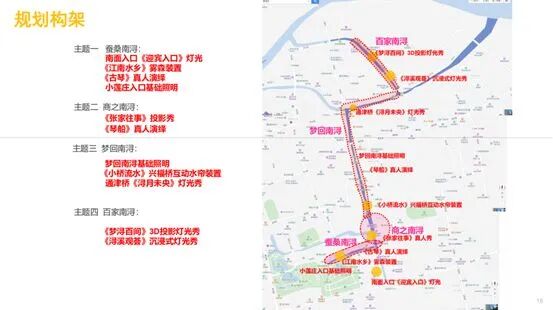 《江南浔梦》为五个部分:“桑蚕南浔、商之南浔、民国南浔、梦回南浔、百家南浔”,共有“农桑水乡、张家往事、小桥流水、浔月未央、浔溪观荟、浔梦百间、鱼水泡影”七个节点。在做到完全保护景区的原始人文景观前提下进行规划,总游线约2公里,游览时长1.5小时-2小时,打造出“动静结合、虚实结合、情景结合”的行浸式光影交互多维度体验。这样的一场互动多媒体行浸式夜游,有特定的人文景观作为载体,有其特殊的地域性和文化独特性。打破时间特性,打破空间限制,打破思想维度,多方位让游客“进入南浔、感受南浔、了解南浔”。