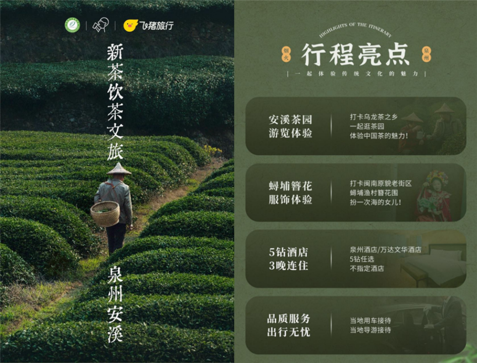 和传统的旅游线路不同,喜茶与飞猪旅行打造的新茶饮茶文旅线路攻略以各地茶产地的旅游资源为基础,不仅包含了各地特色的茶园自然风光、人文历史风貌、非遗茶文化体验游等元素,更融合了喜茶门店打卡、喜茶茶产地深度体验等年轻群体喜爱的新茶饮元素,重点突出茶与茶文化,为消费者带来了全新旅行体验,不仅通过新式茶饮品牌自带的年轻消费召力实现了私域流量焕活公域流量的作用,更是帮助安溪多个以茶为基础产业的乡村实现文旅新经济转型升级。