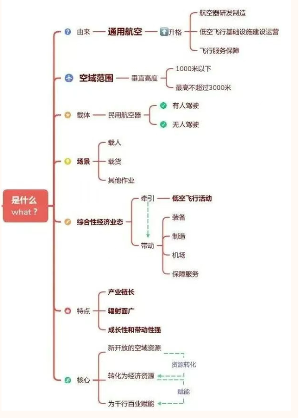 “低空经济+”可视为通用航空的升级版。它整合了航空器的研发与制造、低空飞行基础设施的建设与运营,以及飞行服务保障等多个产业。其核心在于将新开放的空域资源转化为经济资源,从而为各行各业提供支持和动力。低空经济实质上是将低空领域的各种产品、地面相关产业链条以及相关衍生服务整合为一体的综合体。