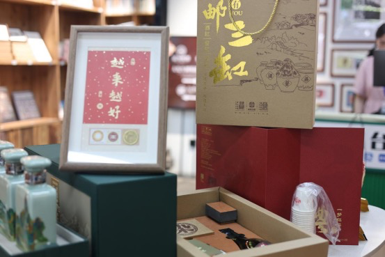 “邮三缸”纪念伴手礼深度挖掘并创新呈现了绍兴著名的“三缸文化”——历史上支撑绍兴经济发展的“酒缸”、“酱缸”、“染缸”三大传统支柱产业。礼盒内包含了一瓶古越龙山绍兴黄酒、一瓶松盛园酱油和一块经过扎染工艺的小方巾,还附赠了一幅弘一法师的墨宝“越来越好”,配以两枚非遗元素邮票,以及一枚采用非遗翻砂工艺精心铸造的“绍兴元宝”仿古币供鉴赏,充分利用设计服务、品牌赋能,提升绍兴非遗的多元价值。