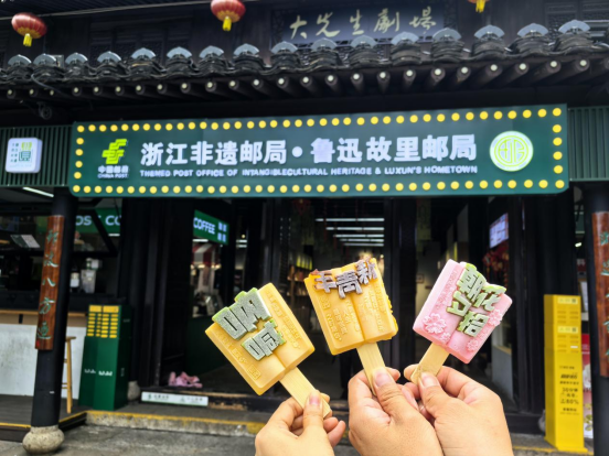 在具体产品打造上,浙江非遗邮局·鲁迅故里邮局充分挖掘在地优势,对绍兴优秀传统文化进行创造性转化和创新性发展,开发出了“文学雪糕”、“邮三缸”纪念伴手礼等一系列兼具创意性与文化味的文创产品。例如邮局推出的全网首款“文学雪糕”——“冰镇文学”系列雪糕,创新性将鲁迅先生不朽名作《呐喊》《朝花夕拾》《新青年》的书名,成为一道融文学、美食与时尚于一体的亮丽风景线。产品一上线便引起游客纷纷打卡,高峰日销量突破200支。