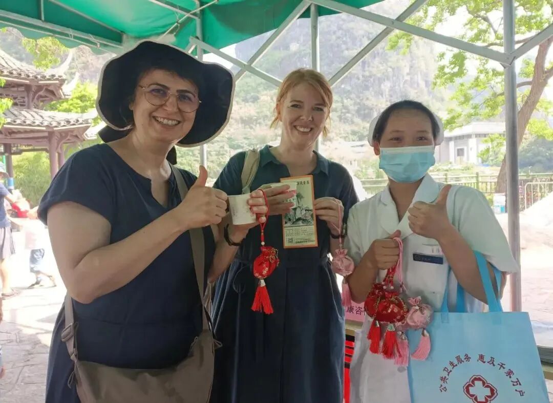 (图片:医护人员赠送中医香囊给外国游客丨来源:阳朔县卫生健康局)