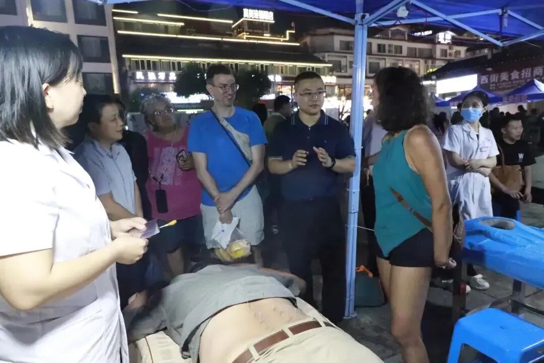 除景区服务外,阳朔县不断拓展中医药与文旅融合的场景边界。5月30日,阳朔中医药文化夜市在西街小广场启幕,全县100余名医护人员参与其中,现场人头攒动、互动热烈。活动设置多维度体验区:中医专家义诊团队以望闻问切为群众辨证施治,手写药方成为夜市“爆款”;中医疗法体验区推出拉筋、正骨、针灸、拔罐等十余种传统疗法,让群众近距离感受中医诊疗魅力;中草药展示区陈列采自喀斯特峰林的鲜活草药,直观普及中药知识;中药茶饮品尝区提供健脾祛湿茶、清暑益气茶、酸梅养生汤等饮品,以味觉体验传递“药食同源”理念;知识问答、免费药品赠送、急救知识教学等区域人气高涨,八段锦、太极扇等中医健身功法展演与心肺复苏、海姆立克急救法实操教学相映成趣,吸引众多市民游客参与。此次夜市活动服务中外游客及市民1600余人次,赠送中药香囊600个,不仅搭建起中外文化交流的开放平台,更以接地气的方式传播中医药文化,为“建设阳朔先导区 建功桂林世旅城”注入活力。