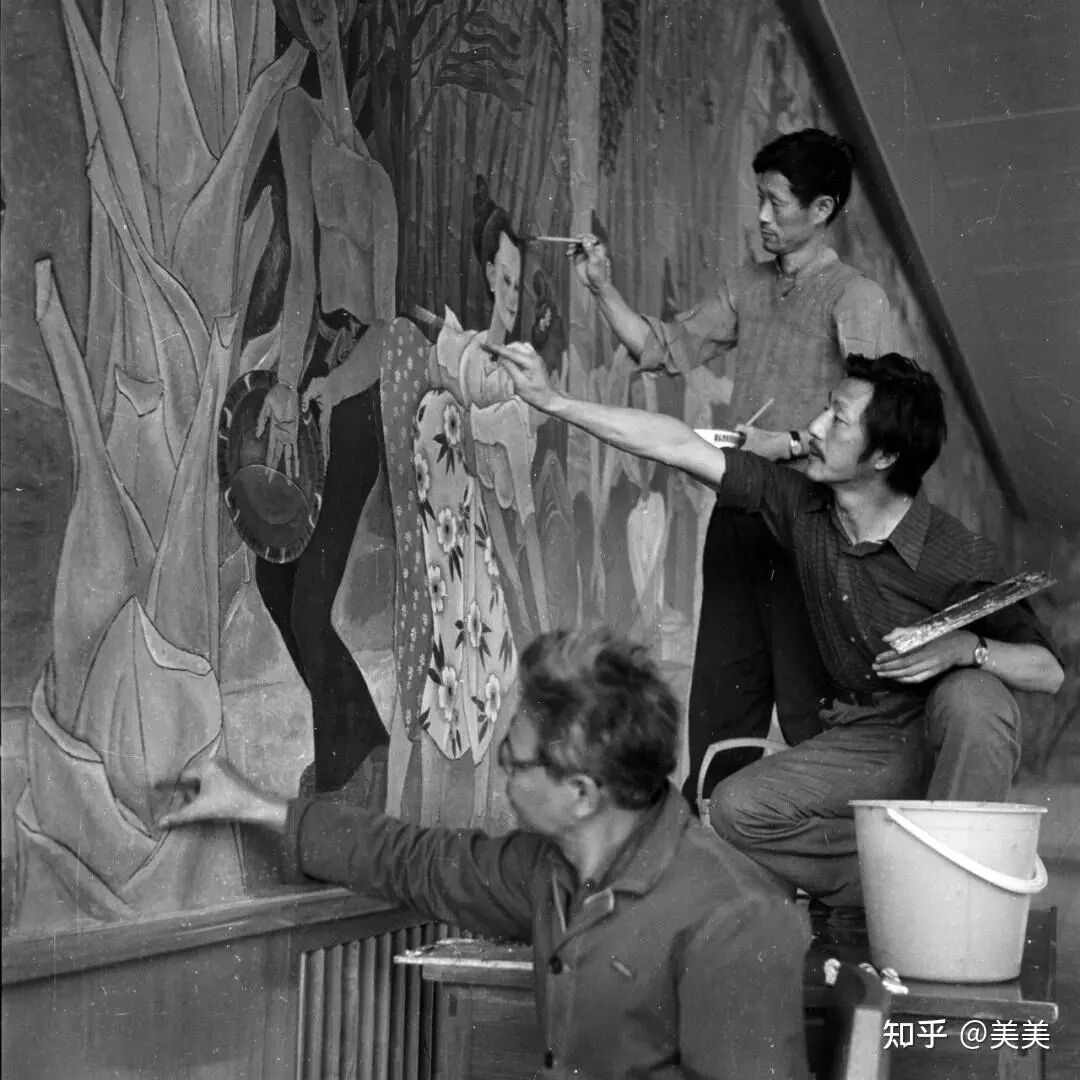 (图片:1979年夏 首都国际机场壁画《泼水节-生命的赞歌》的作者袁运生在创作绘制中|来源:网络公开)
