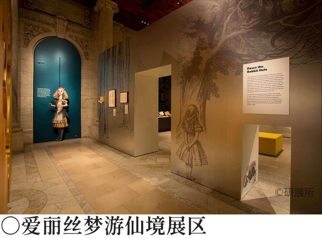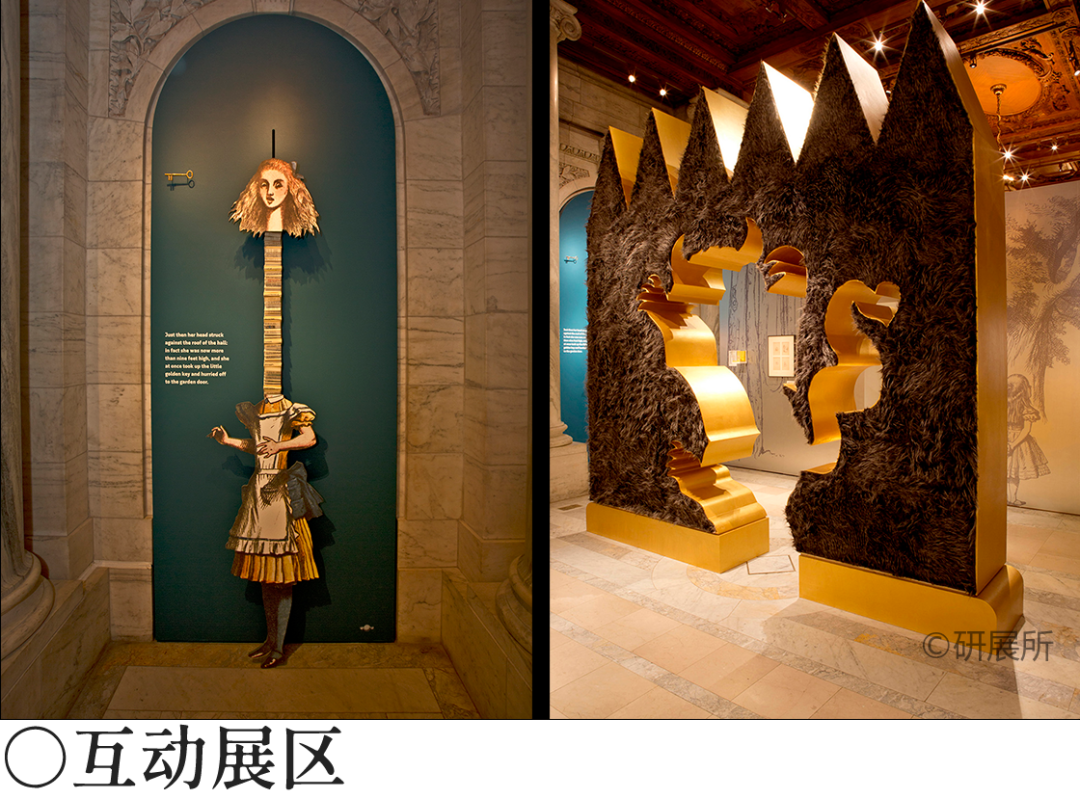 #展厅设置多个基于名著的“沉浸空间”,如 《爱丽丝梦游仙境》般尺寸扭曲的门道,让观众在空间中体验书中的场景,不是干巴巴的展示书中的内容。