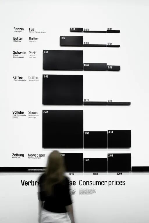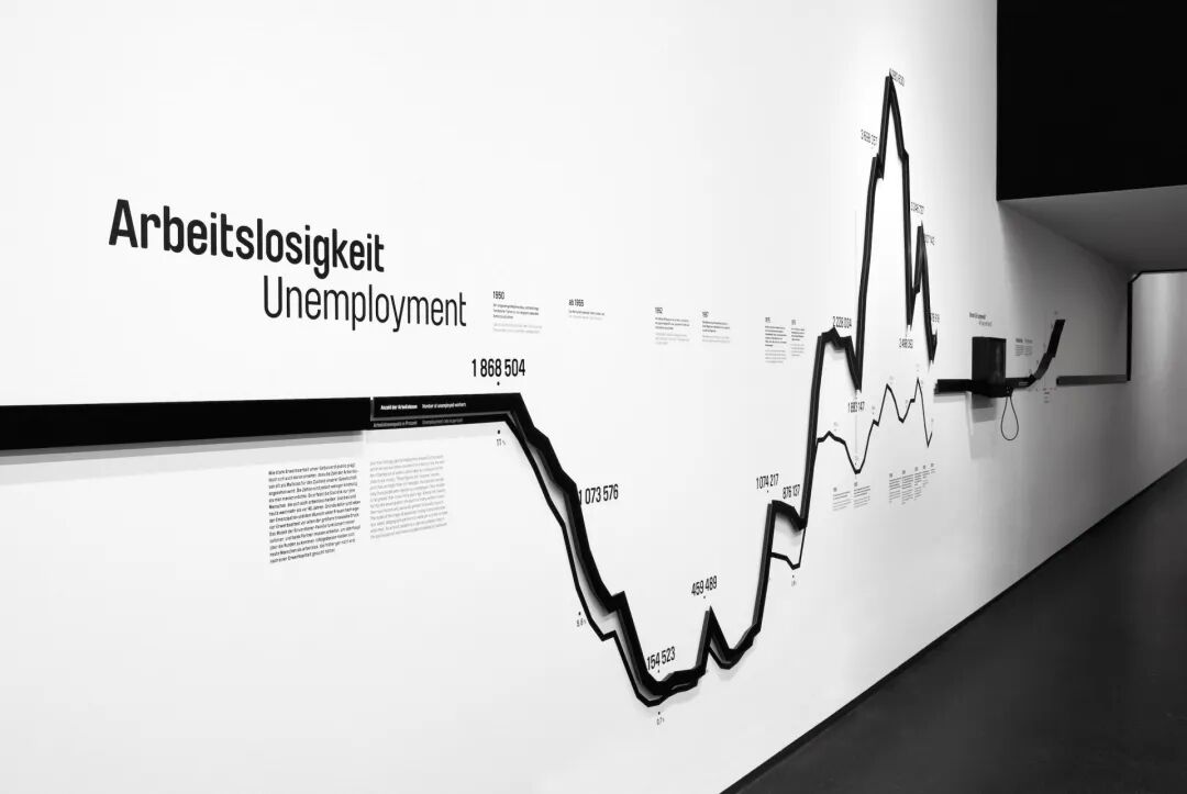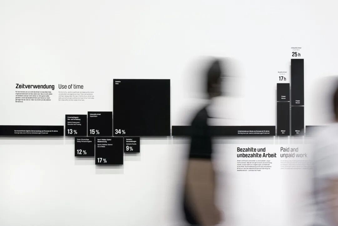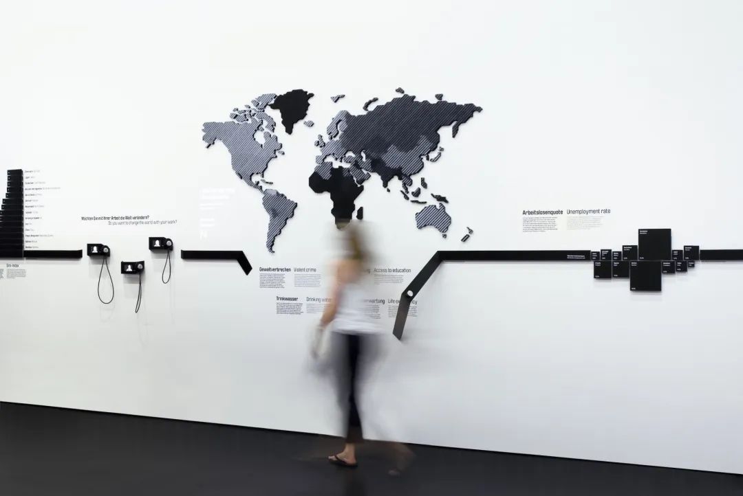 黑色铝条作为统一元素延伸到展览的所有房间,涉及工作对人和社会的作用和意义。