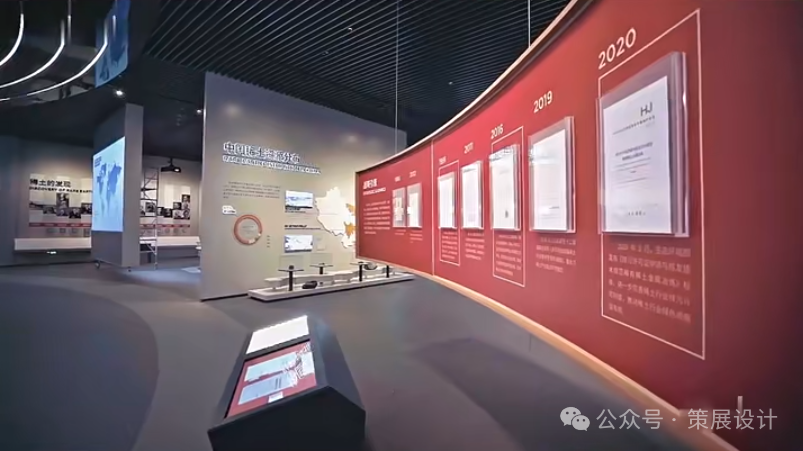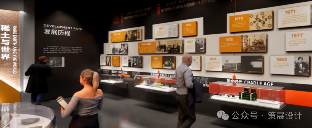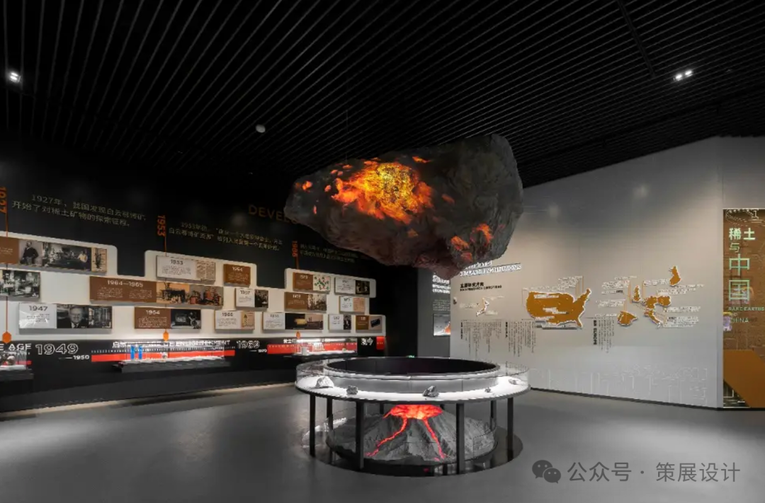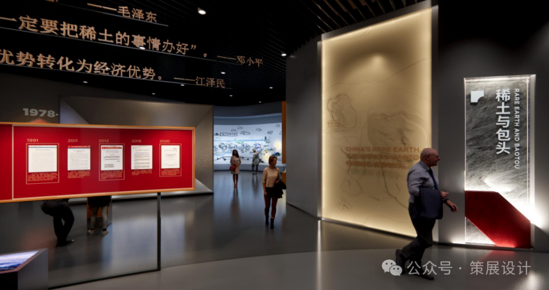 则展示了中国稀土产业发展的辉煌历程。这里通过战略定位对稀土产业发展的重要论述,展示了中国稀土产业发展过程中具有重要意义的政策文件。一幅巨大的中国地图上标注着中国四大稀土矿区的情况,相关的稀土矿石也在这里展出。稀土元素的应用科普以及四大矿区的不同开采方式科普让观众对中国稀土产业有了更加深入的了解。