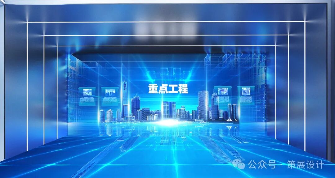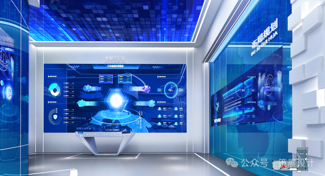 序厅空间以纯净白作为空间主色,辅以科技蓝点缀,极具未来科技感,彰显集团恢宏大气的企业气度与格局;