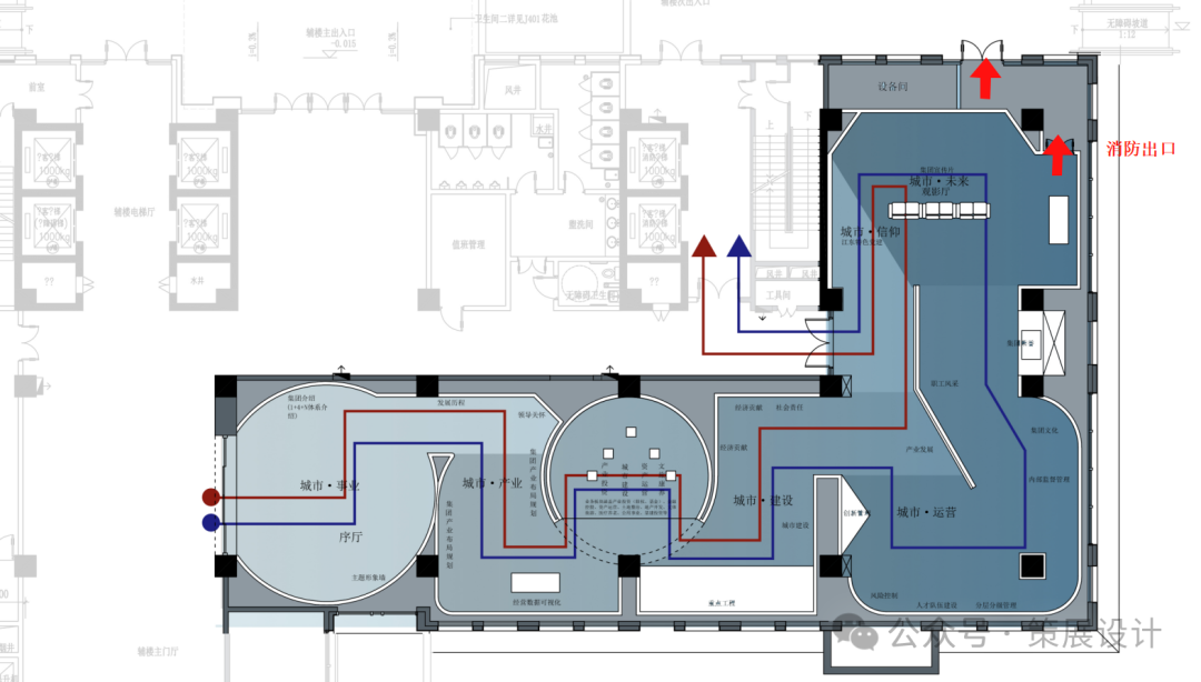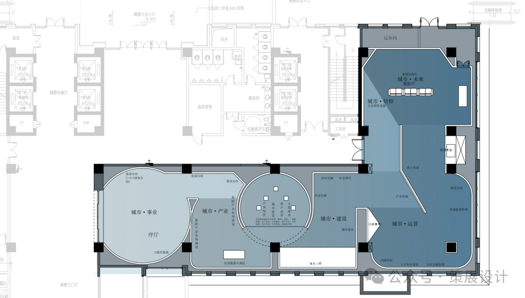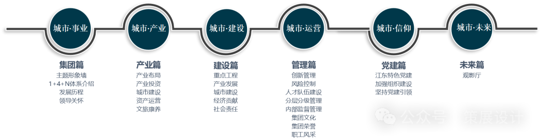 内容上由主题形象墙、1+4+N体系简介、发展历程与领导关怀四部分组成,整体给参观者留下集团初步印象的同时,也将集团发展与城市建设联系在一起,为展馆后续展项展示拉开序幕