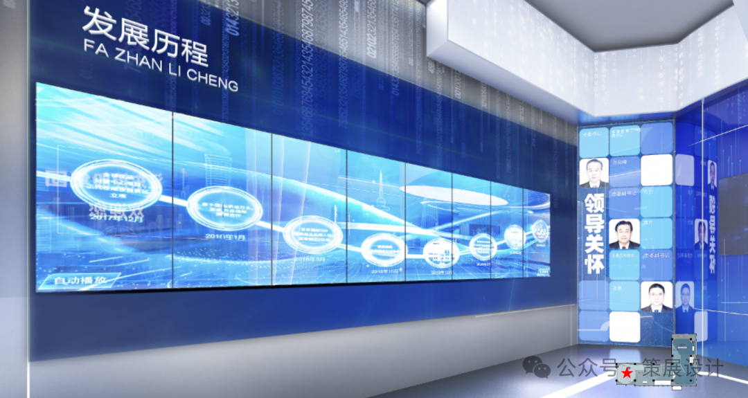 发展历程以拼接屏形式展示集团自成立至今发展中的重大事件与成就,屏上可见详细历程时间轴,触控屏调取目录(也可pad操控)选择其中一个节点,屏上即呈现该时期重大事件介绍相关内容;