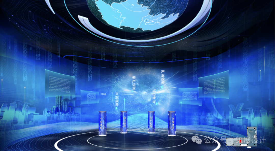 集团业务板块打造元宇宙沉浸式cave空间,空间内四台控制柱和弧形投影幕联动分别讲述江东旗下四大子集团所涉足的九大业务范围,与上方穹顶图案及地面形成一个整体,使参观者沉浸在江东集团整个业务场景中