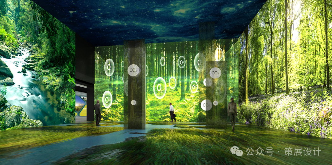 通过三维全息技术构建了一个栩栩如生的森林场景。在这个场景中,参观者可以仿佛置身于美丽的森林之中,感受郁郁葱葱的林木、鸟语花香的环境以及溪流淙淙的悦耳之声。这一场景不仅增强了参观者的沉浸感和代入感,还让他们对碳中和和森林碳汇有了更加直观的认识。参观者还可以通过触摸透明屏来互动吸收二氧化碳并将其转化为清新的氧气。这一互动体验不仅增强了参观者的参与感和趣味性,还让他们对碳中和的过程有了更加深入的了解。