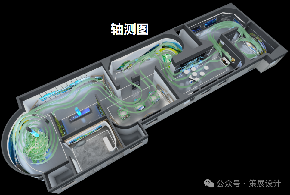 两山展示馆在功能布局上每一板块区分明确,以大开大合的空间结构进行设计,每一板块有区分有结合,整个空间使用飘带相连与展示逻辑“两山萌发、两山蓄势、两山勃发、两山成果、未来展望”完美结合,在物理层面上形成一条指引参观动线,在意识层面是开化县两山实践的发展史。