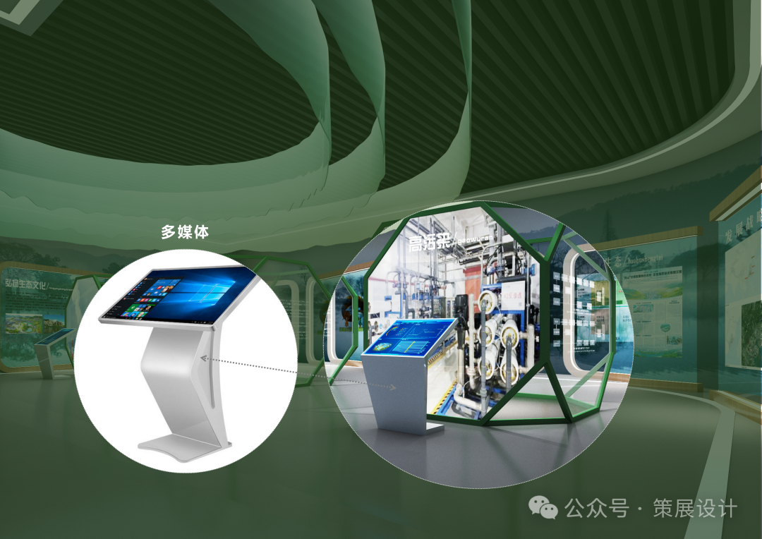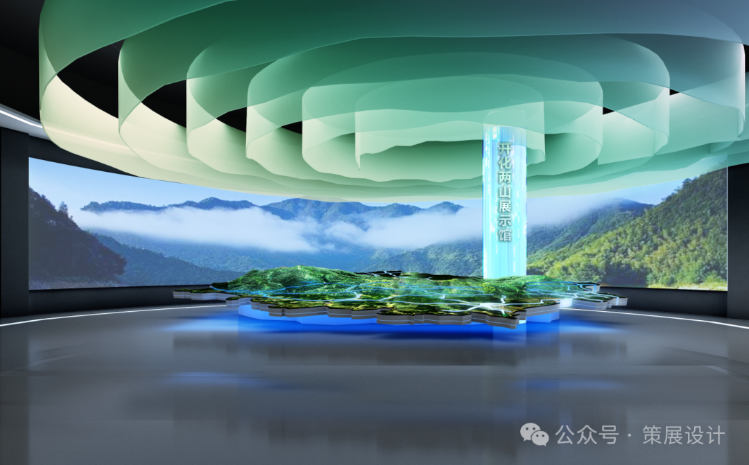 厅以VCR投影视频结合开化县全域电子LED沙盘宣传开化县地理位置、两山发源、生态美好等优势 ,与LED软膜屏包柱及开化县特有的钱江源水文化元素飘带设计形成一幅开化县特有的生态画面,使步入展厅的参观者一下子就融入开化县美丽的生态环境中。