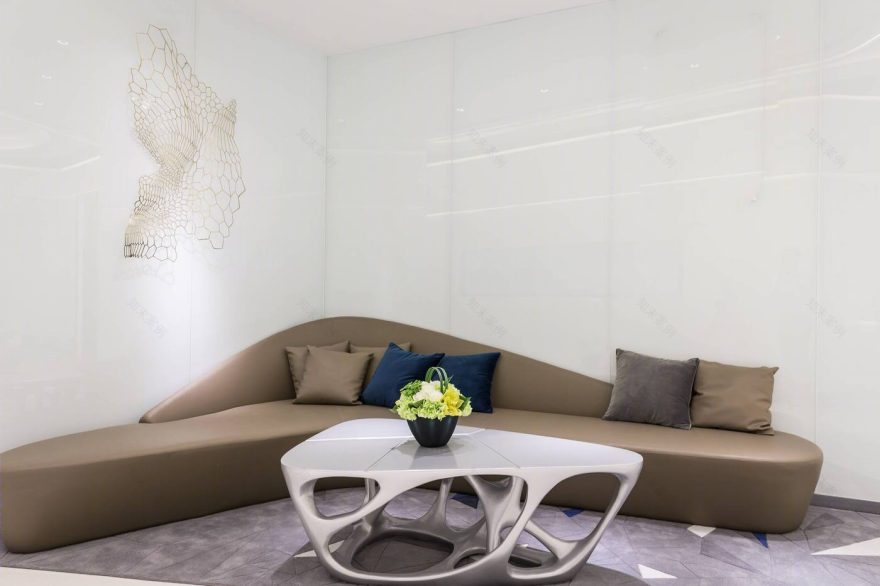 在大厅等待区的一角,设计师巧妙地摆放了不规则的沙发和茶几,其中一款以建筑大师扎哈风格设计的月亮沙发尤为引人注目。这个独特的沙发设计赋予了区域一角璀璨夺目的光芒,其立体感的造型为空间注入了精心设计的元素。