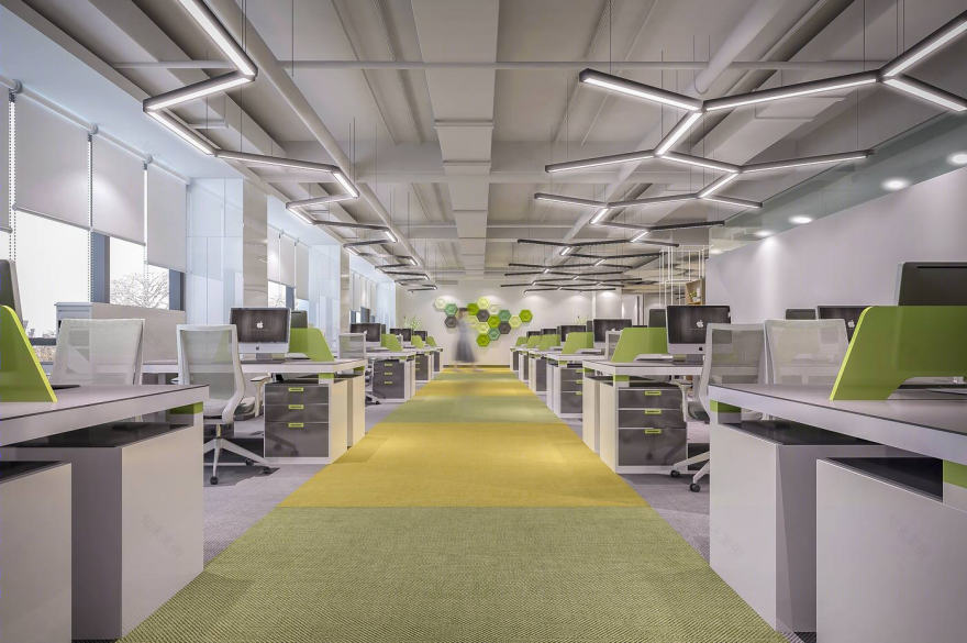 开放式办公区的设计以绿色作为主要象征生命健康的元素。办公空间的尺寸设计合理,旨在实现便捷的存储和整理,以确保高效、整洁的工作环境,并保持办公人员之间互不干扰的品质。