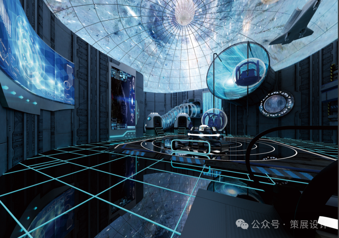 人工智能互动+交互式沉浸体验+7D太空影院:展区内设置缆车通道贯穿海洋、太空两个展区,展厅中设置LED光柱模型、海洋场景模型、360度剧场、VR体验区、外太空7D影院等现代多媒体技术手段。通过暗室,视频墙,微声,同时播放让观众体验“上天入海”的心动感觉。