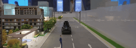 凡拓数创团队设计打造车联万物主题大型交互场景沙盘,集中演示了超视距感知技术与车路协同三大应用场景。