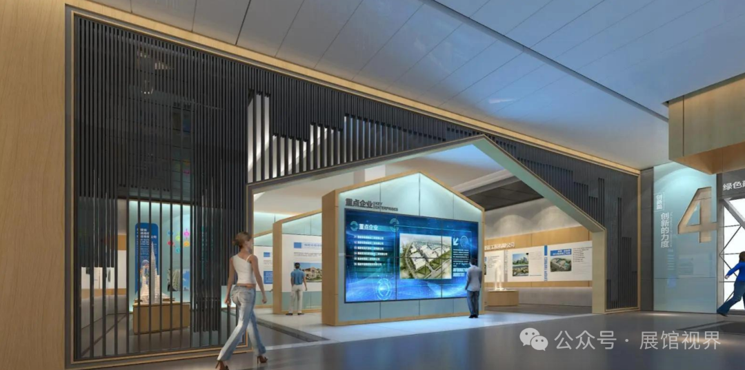 参观动线——穿过大厅,从右侧入口进入,依次参观概况篇、历程篇、转型篇和创新篇等展区后,再进入大堂另一侧观览规划篇及招商篇相关内容。