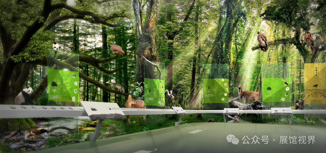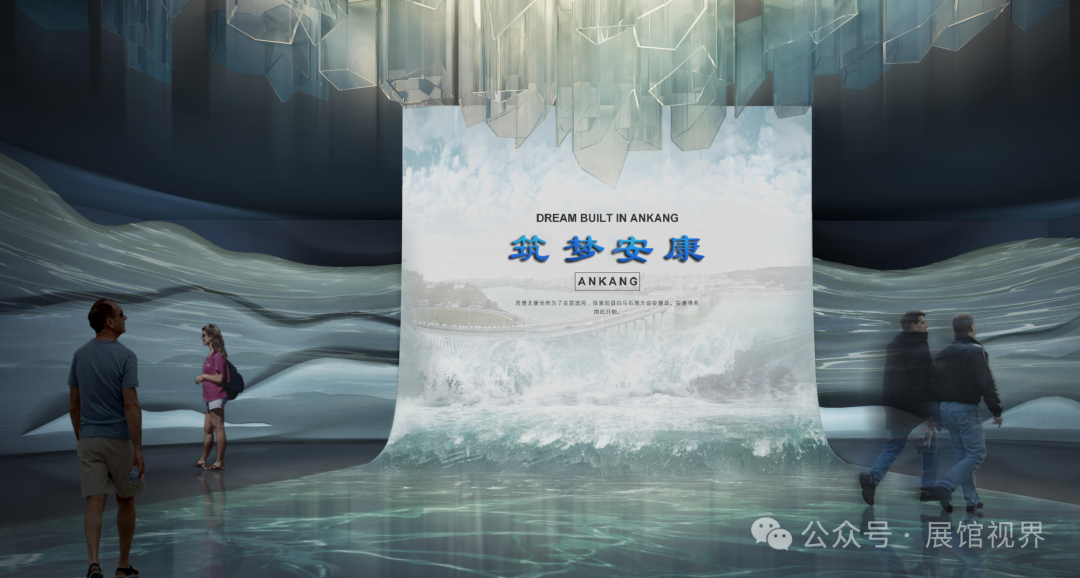 序厅空间设计提取安康"两山夹一川"的地貌特征演绎为空间形态,以写意的氛围形象、趣味的直观展示,呈现山水之间、西部水乡的地域特色,为参观者营造沉浸式的入馆体验,快速带入安康地域文化语境。