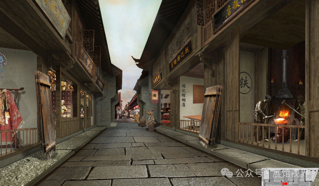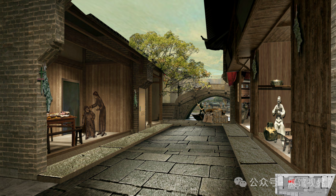 而那忙碌的水埠,更是还原出沿河路廊的热闹场景。瞧,在那忙碌的清晨,河里船只来来往往,一片繁忙。岸边码头上,正稳稳停靠着三五艘带着遮篷的小货船,客商们神色匆匆,有条不紊地指挥着搬运工人装卸货物。再看对面水埠,三两个妇女正蹲在埠头,一边洗衣、洗菜,一边唠着家常,欢声笑语交织在一起,构成了一片热闹祥和的景象,让人身临其境,仿若穿越时空,回到了那个充满烟火气的往昔岁月。