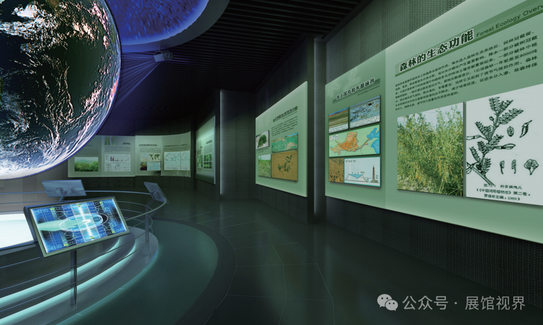 这是展示林业资源与森林生态功能的展示空间。中间的大地球是一巨大的内投球,演示地球上森林覆盖率的变化,周围的触摸屏可与之互动。展厅的展板以丰富详实的图文,解读森林的生态功能。
