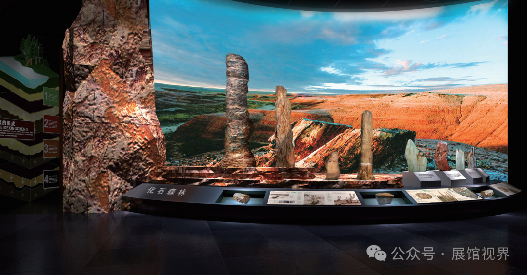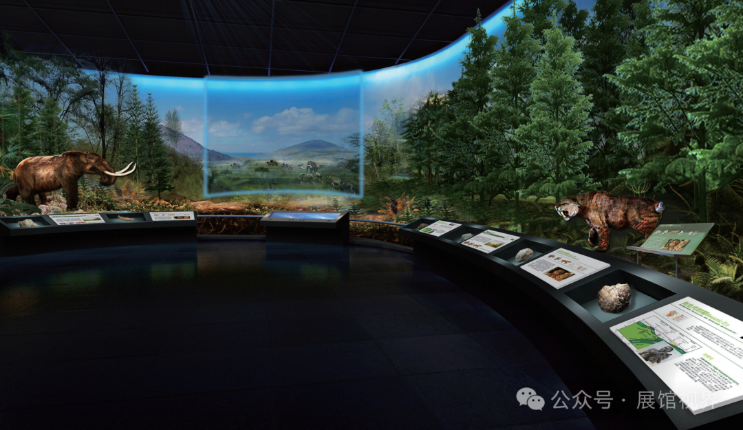 依托环形墙壁形成地球演化走廊,展示从太古代、元古代、古生代的地球生命演化史。演化走廊将地球事件、植物事件、动物事件结合起来,采用立体景观、伴景画、化石陈列等手段,构建了立体丰富的地球生物演化轨迹。展厅中心区营造平面电子景观,配以生命钟的刻度表,浓缩46亿年地球演化史。中心地投屏演示地球的形成过程。