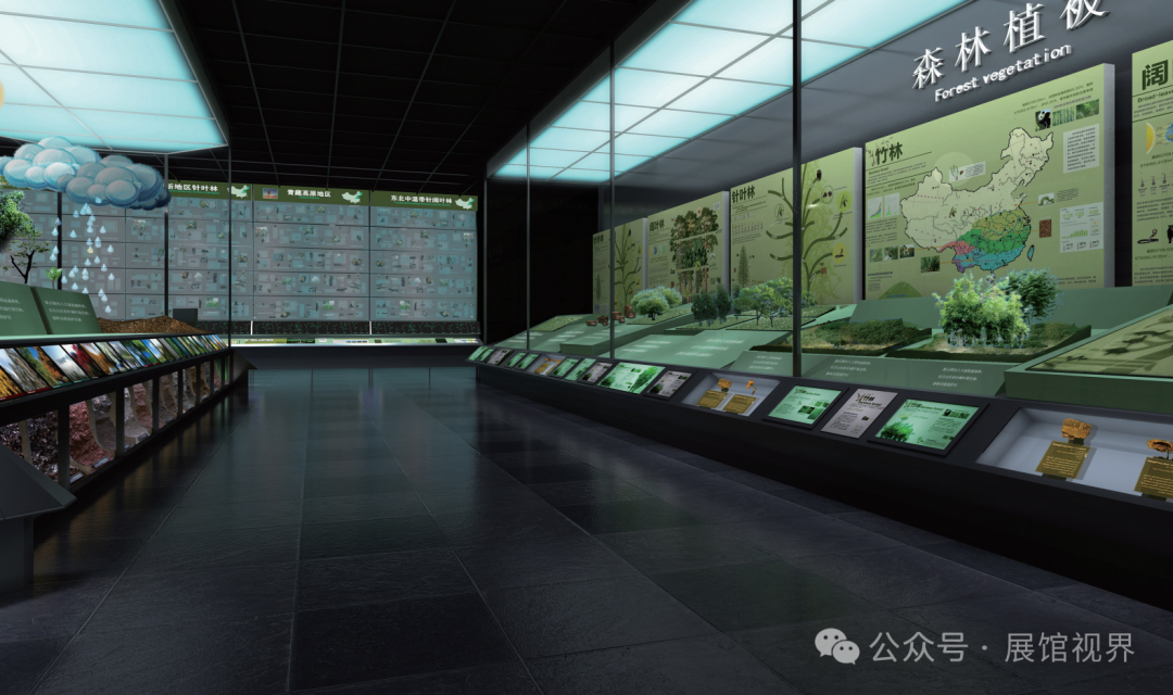 现代简洁的橱窗展柜便于管理、拆卸,通过森林的自然分类(针叶林、阔叶林、竹林、灌木林)来分别介绍地球上丰富的森林植物资源。橱窗里造型丰富的多样性展板展示不同林纲的分布与物种习性。在展厅中,以几何体块相互穿插,巧妙的组合出大型通体展柜,并且配以文字、图片、视频,融合了本展项的三组内容:1、树木的生命周期;2、森林与土壤;3、森林与气候。通过科学、准确、生动的方式来展示三组内容的相互依存、相互作用、相互共生的生态价值,呼应了概念主题思想:森林与生物的同呼吸。