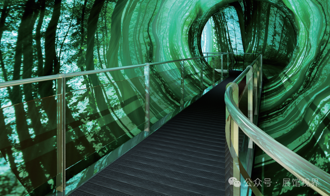 以主题墙为森林标识为主要元素,标识似一棵完整的树,树干部分是中国版图的形状,诠释了“中国森林博物馆”的馆名;标识又似茂密的森林,寓意中国将被森林覆盖并根深枝茂,体现了中国加强森林生态建设,积极应对自然恶化及建设和谐社会所作出的努力与贡献,彰显中国维护全球生态平衡的信心与决心。序厅的入口以树切口为设计,进入到树干内部即呈现沉浸式的时光隧道。