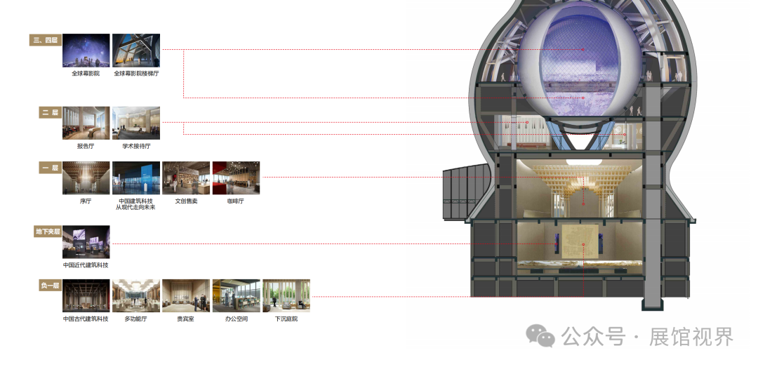 地下一层至地上一层的主体区域规划为展厅,这里将完整呈现中国建筑科技从古至今的发展脉络,见证岁月长河中建筑智慧的传承与革新。一、二层错落分布着序厅、大堂等公共区域,为观众提供交流、休憩与过渡的空间。而全球幕影院宛如一座宏伟的空中巨幕,其独特的构造跨越了三、四层,将为观众带来震撼的视听盛宴,开启一场奇幻的沉浸式体验之旅。