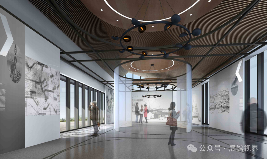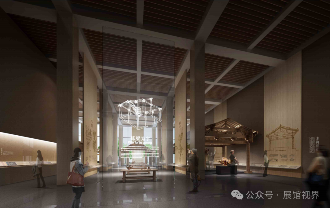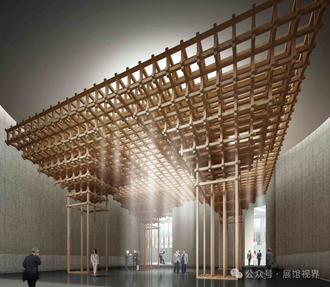 踏入正门,序厅跃然眼前。映入眼帘的是木结构设计,其井然有序的排列与富有节奏感的韵律,无声诉说着 “技术发展的终极归宿乃是对美学的不懈探寻” 这一理念。木质材料的运用,宛如冬日里的暖阳,为空间注入融融暖意,更如同将自然的质朴本真引入其中,赋予其浑然天成的质感。