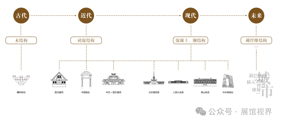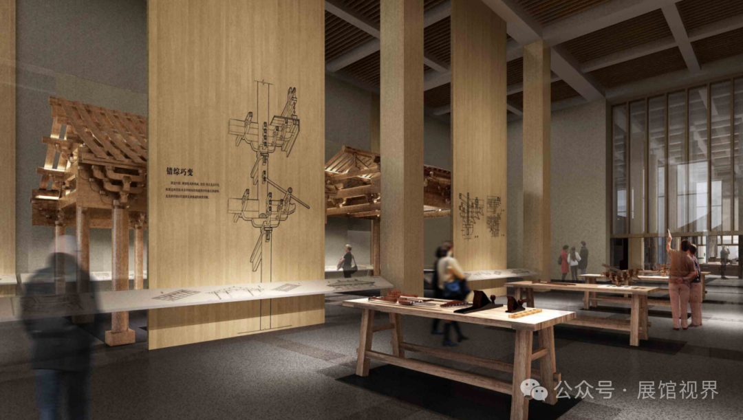 展览以时代为序,以专题方式展开,勾勒出中国建筑科技历经 4 个进程:启蒙、发展、定型直至巅峰的古代经典时期;中西交汇、新旧接替的近代过渡时期;模仿探索、多元融合的现代繁荣时期;与时俱进、领先世界的当代创新时期,反映时代特色,体现不同时期中国建筑的风格与技术特点,进而引发人类对未来建筑的美好憧憬。展览形式设计依此展开。