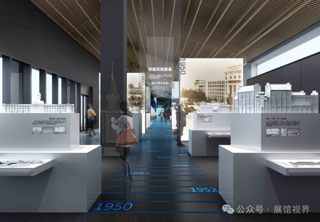 该展区主要展示新中国成立后,建设首当其冲尝试将新兴的社会风尚表达出来。该展区主要以数字透明屏+数字投影结合实物模型等方式展示,从民族风格,到受苏联影响的国际风格,再到为勤俭节约而尝试的新古典主义风格,及改革开放后所带来的多元化风格,中国建筑经历了继承、改正、汲取及开放的探索历程。