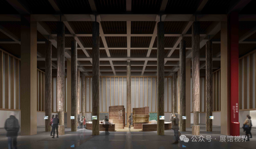 踏入展区,抬眼便可见其独特的空间架构。众多粗壮的原木柱昂然挺立,它们既是整个空间的坚实脊梁,承载着上方的重量,又似从远古森林中移植而来的自然之魂,散发着质朴且浓郁的原始气息,让每一寸空气都弥漫着自然的芬芳。尽管木柱数量可观,但设计师匠心独运,将它们疏密有致地布局于空间各处,使之秩序井然,毫无拥塞之感。梁与下方的原木柱默契呼应,仿佛是自然的双手编织出的精巧纹理,丝丝入扣,进一步雕琢出浑然天成的自然风格,为整个空间勾勒出一种既贴近自然本真又遵循内在秩序的和谐美感,宛如一曲凝固的森林乐章,每一处音符都恰到好处地奏响在观者的心弦之上。