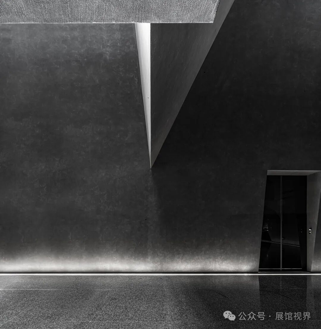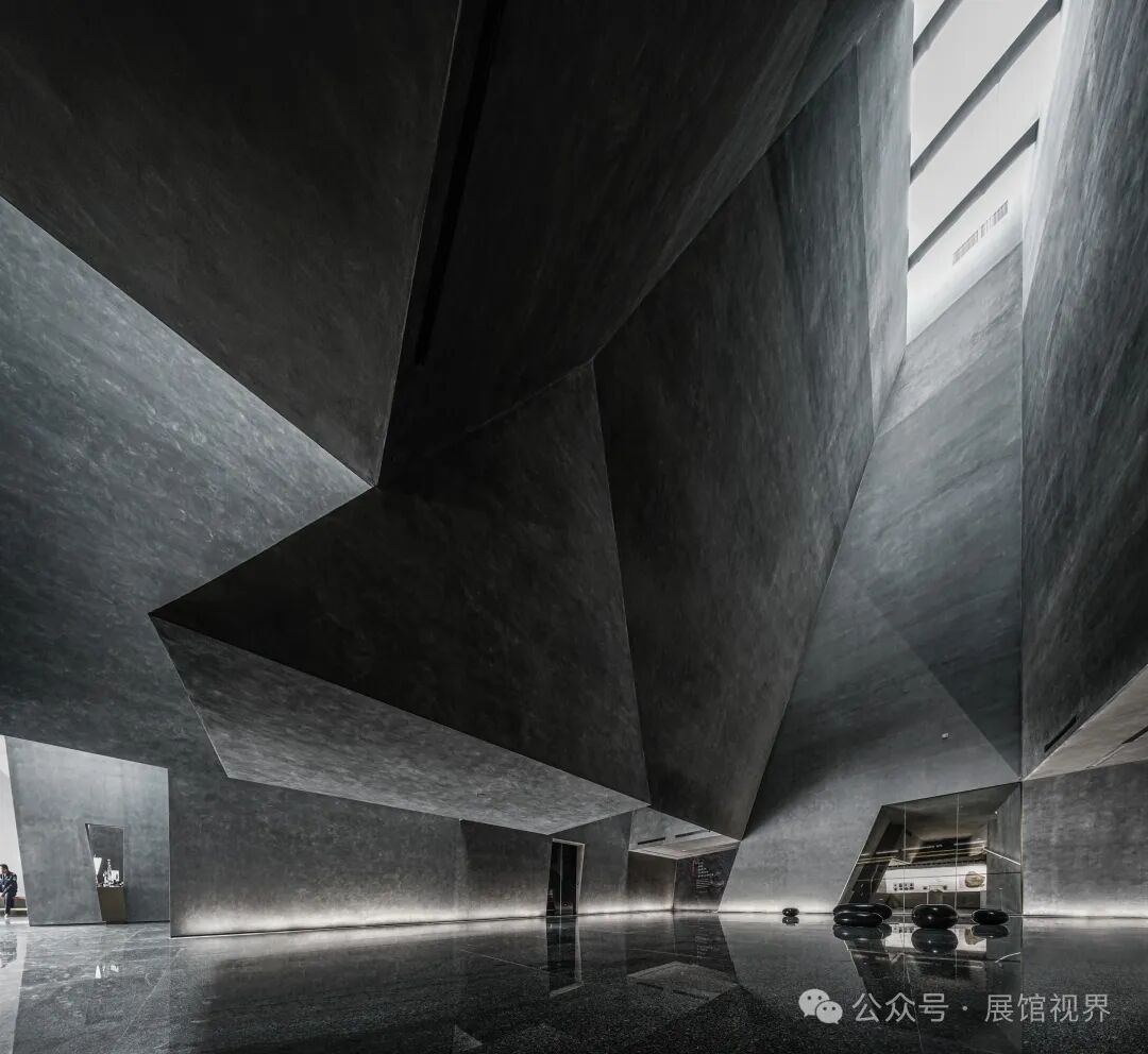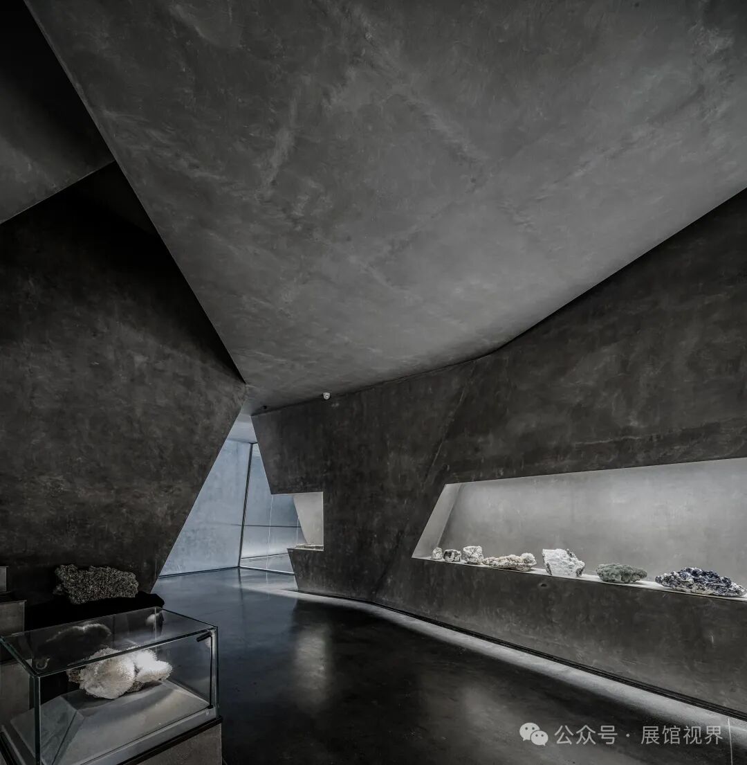 博物馆整个空间没有多余的装饰,用最原始的表达方式记录沉积亿万年的古生物印记,只使用了一个简单的构成元素——墙壁,这种简单性带来的是空间、尺度和光线体验的前置。墙壁不再仅仅是功能的分割界面,它的使用被重新创造:不仅带来平静冷峻的洞穴般的气氛衬托年代久远的地质化石展品;晶体的墙壁内部是博物馆的天花,墙壁外部承载了办公楼层的反光板功能,同时间隔了公共和私密两个分区。