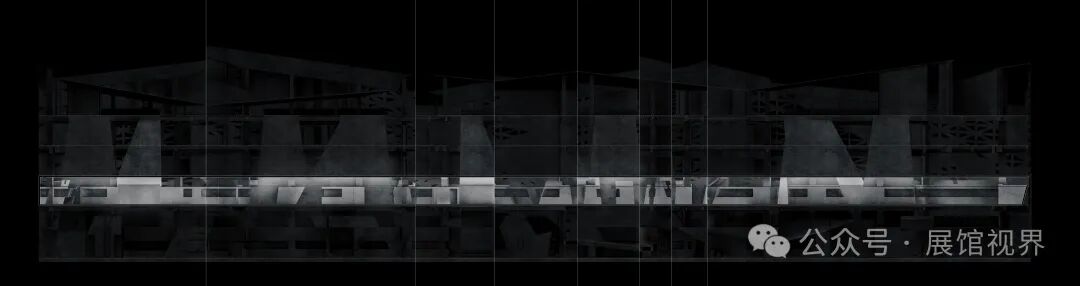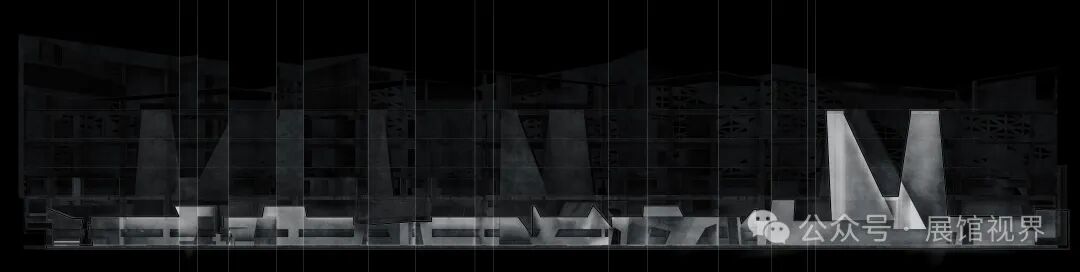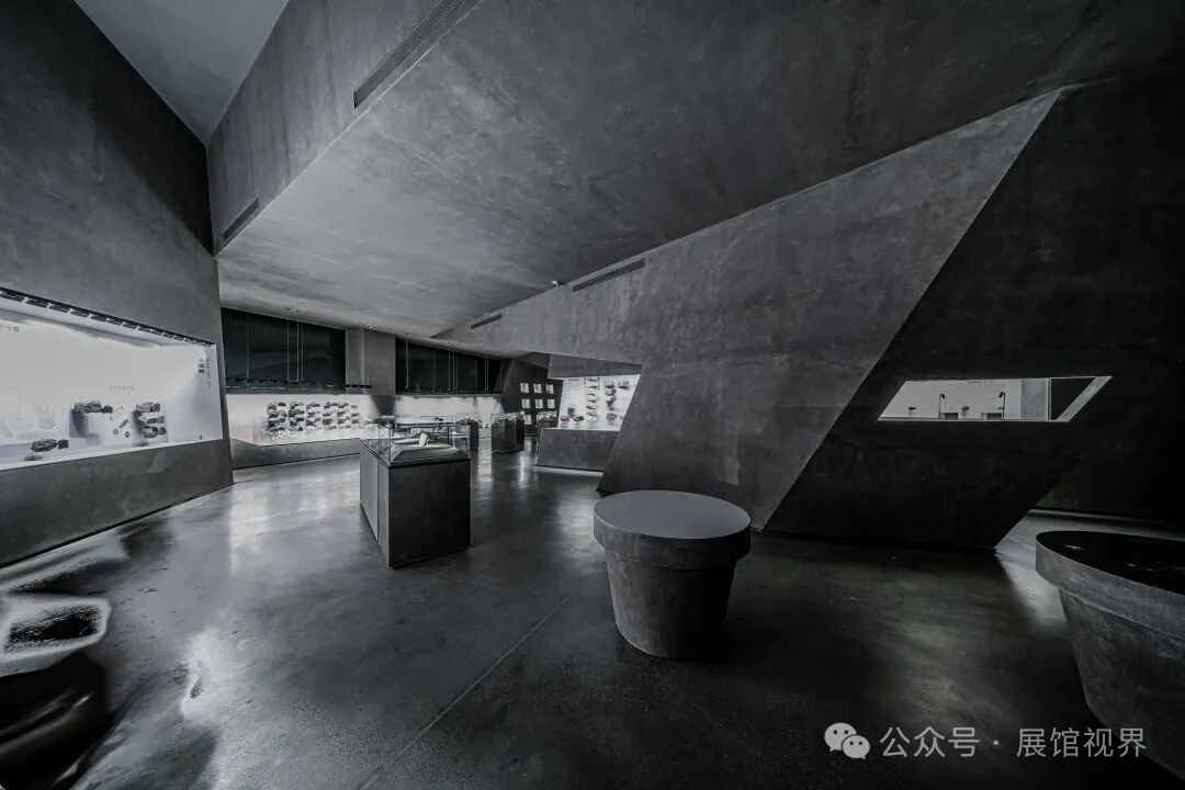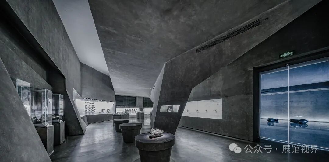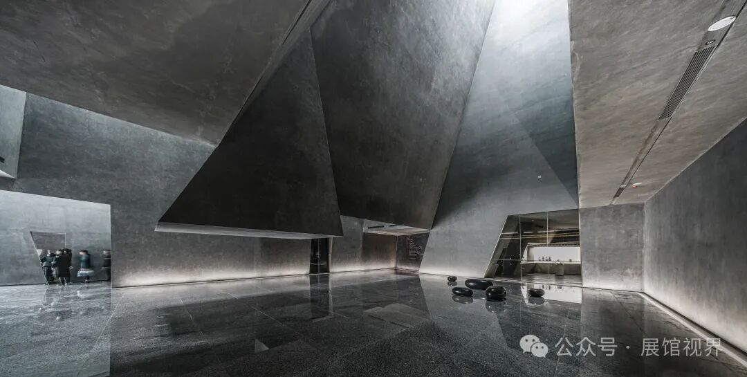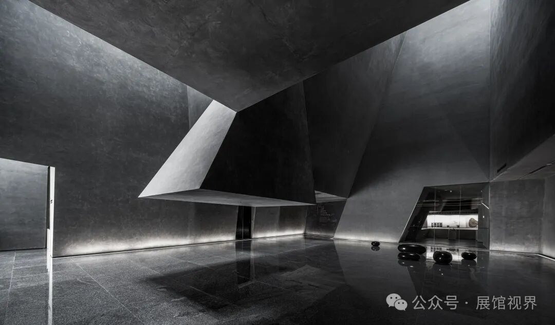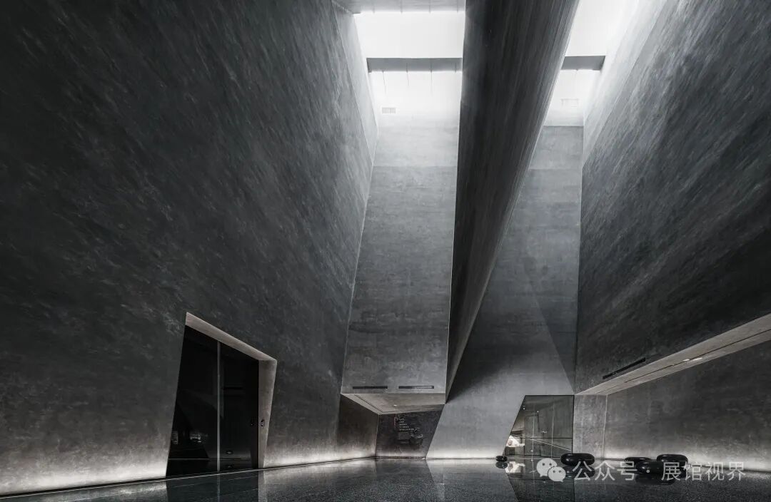 博物馆整个空间没有多余的装饰,用最原始的表达方式记录沉积亿万年的古生物印记,只使用了一个简单的构成元素——墙壁,这种简单性带来的是空间、尺度和光线体验的前置。墙壁不再仅仅是功能的分割界面,它的使用被重新创造:不仅带来平静冷峻的洞穴般的气氛衬托年代久远的地质化石展品;晶体的墙壁内部是博物馆的天花,墙壁外部承载了办公楼层的反光板功能,同时间隔了公共和私密两个分区。