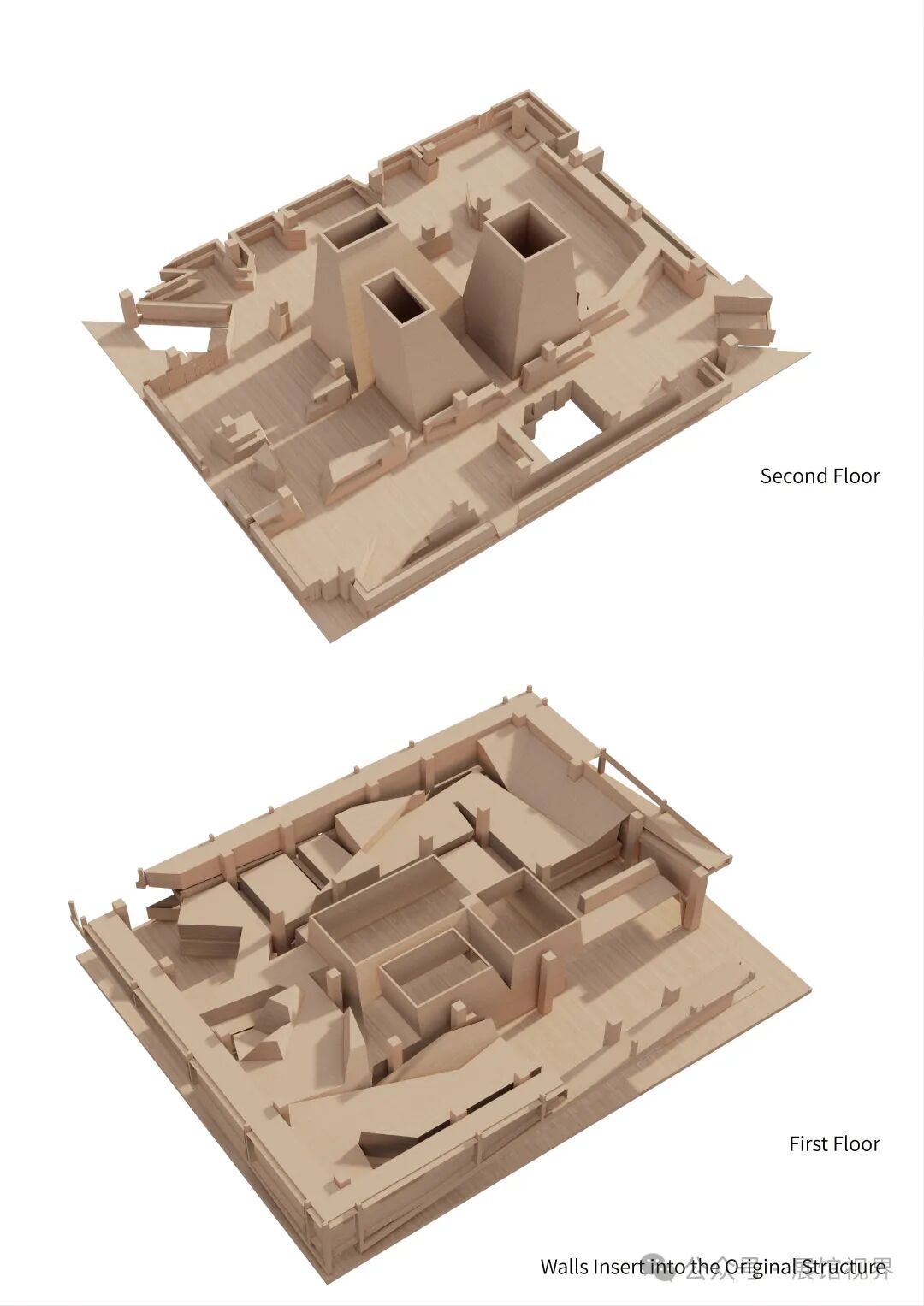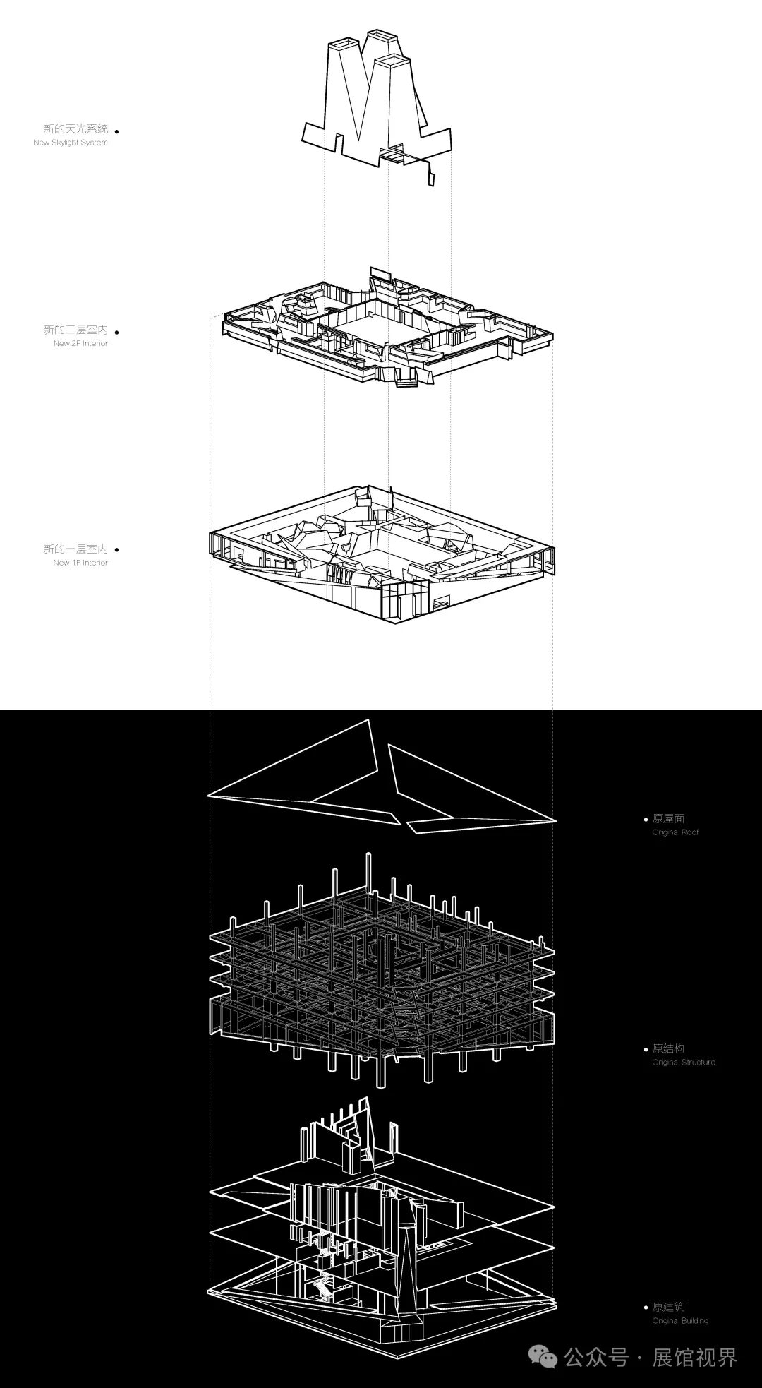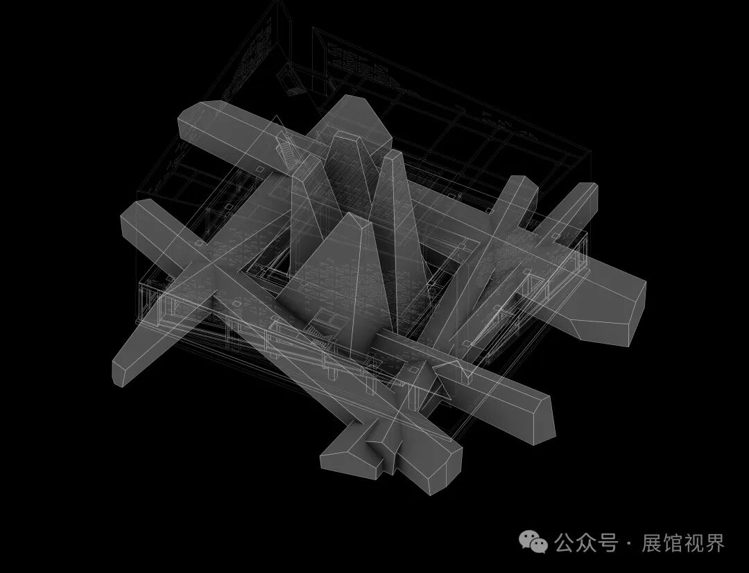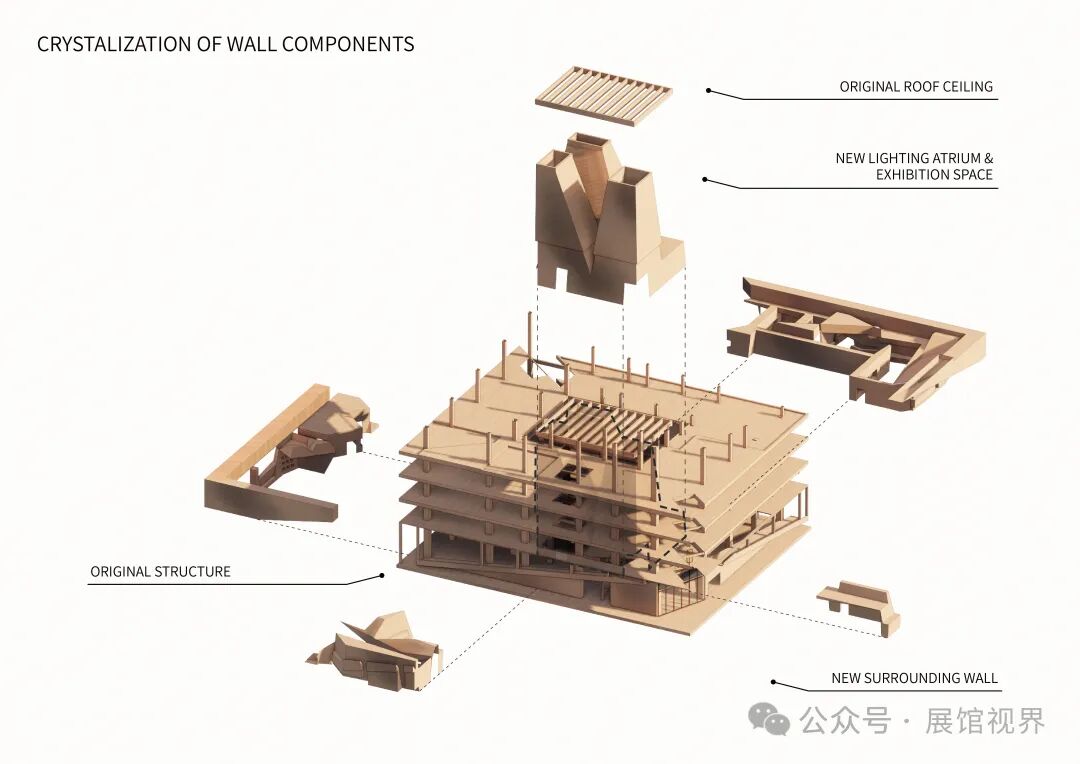 古老岩石最先出现在大陆内部的结晶基底之中,这些古老的晶体经过长时间地壳变化产生的高温、高压、混合、沉积,最终形成现在石头的样子。我们通过对石材最原始的形态:“晶体结构”的解读中获得了新的建筑语言。我们在中庭中引入三个相互穿插的晶体,它们有如金字塔般的锥筒,其倾斜的上外表面可以将一部分天光反射到中庭四周的办公室里,而在筒内,另外的一部分天光则可以直达一层的博物馆大堂。围绕着这些垂直通高的晶体,一些横向的晶体与中庭纵向的晶体生长、穿插在一起形成了一个个的化石展厅,展厅的布局根据展览的时间和故事线索行进展开。这些水平的晶体沿着自身的生长方向也把一部分外立面上的室外的光线引入到博物馆展厅室内——最终这些横竖交错的晶体将光线、展览功能交织在一起。