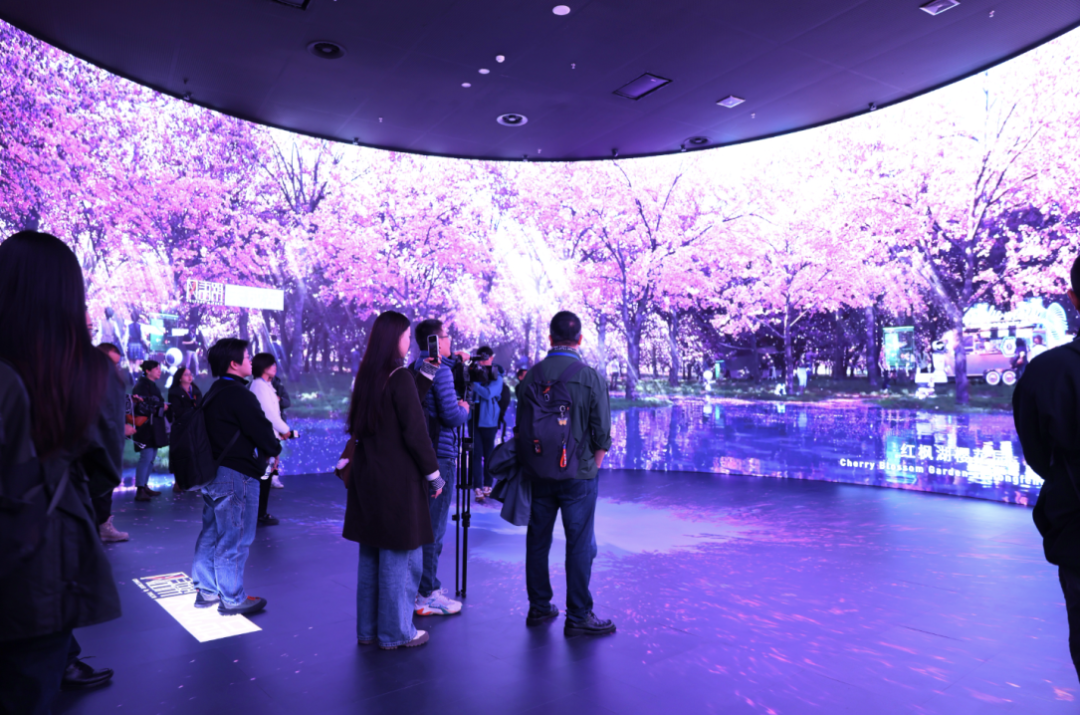 最令人震撼的是360°的沉浸式体验空间。在这里,数据、樱花、星空三个场景交织成如梦如幻的画卷,每一次转身和凝视,都能让人发现新的惊喜和感受到新区对未来的执着追求。