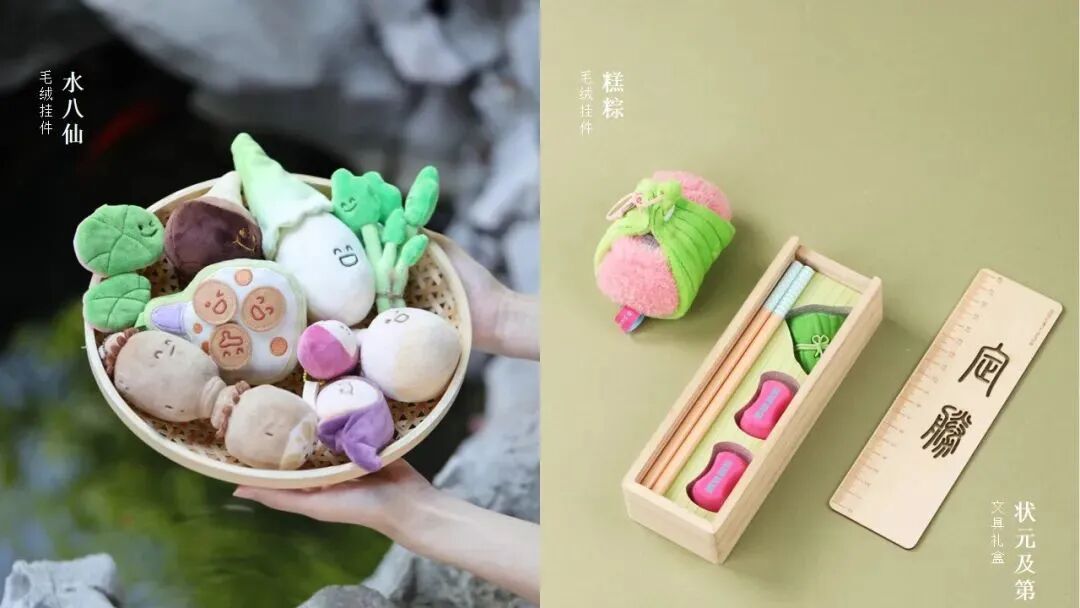 另一款“状元及第文具礼盒”和“糕粽毛绒挂件”,则用苏州传统饮食定胜糕里,带给观众美好的寓意和体验。
