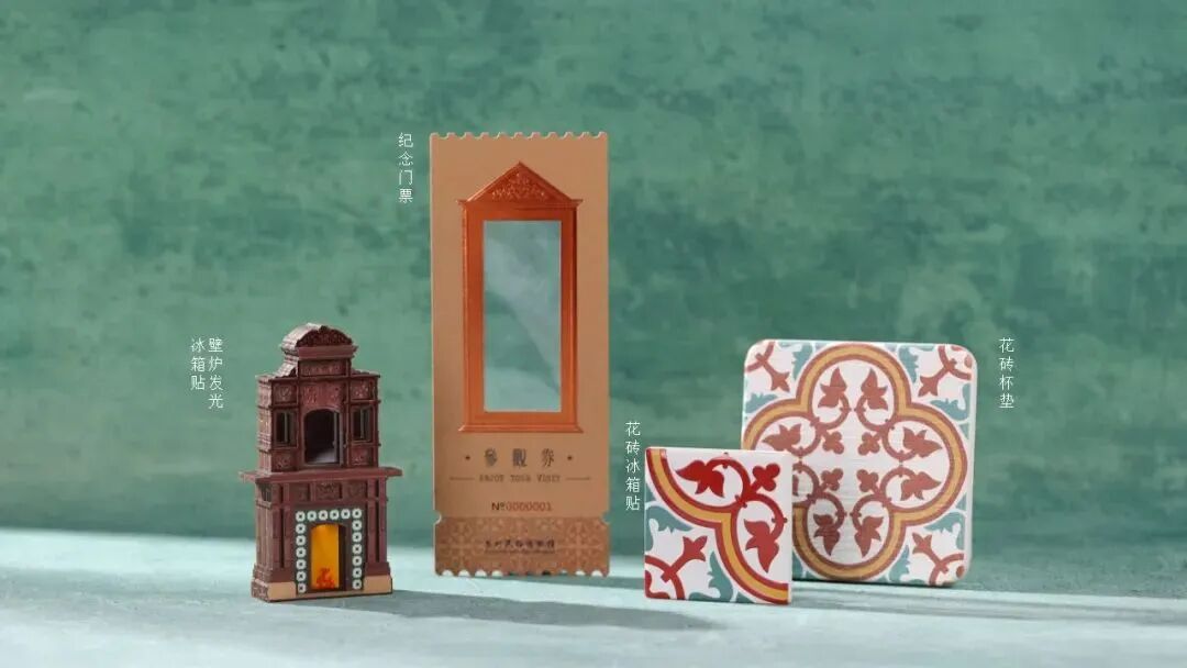 首先是基于民俗博物馆建筑开发的壁炉发光冰箱贴、花砖杯垫、花砖冰箱贴,以及为开馆特别呈现的纪念门票,每张门票上还有唯一编码,为参观带来有温度的记忆。